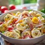 - In a large bowl, combine all the ingredients: tortellini, meats, veggies, and cheese.