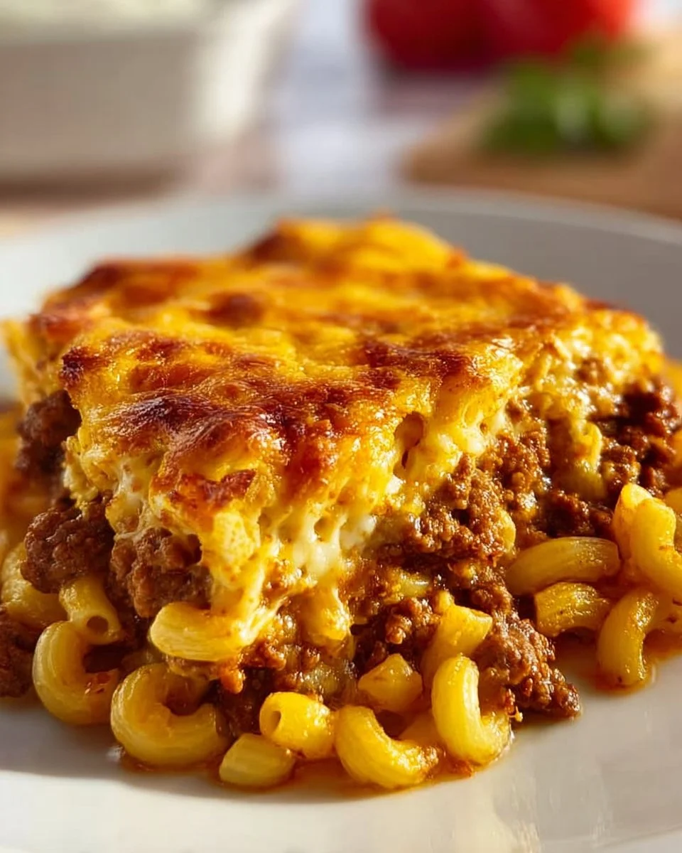 A creamy and cheesy casserole combining tender macaroni noodles with a savory beef mixture, perfect for busy weeknights.