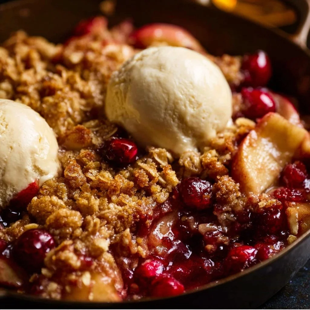 A delightful dessert featuring sweet apples and tart cranberries topped with a crunchy crisp, perfect for fall gatherings or cozy nights in.