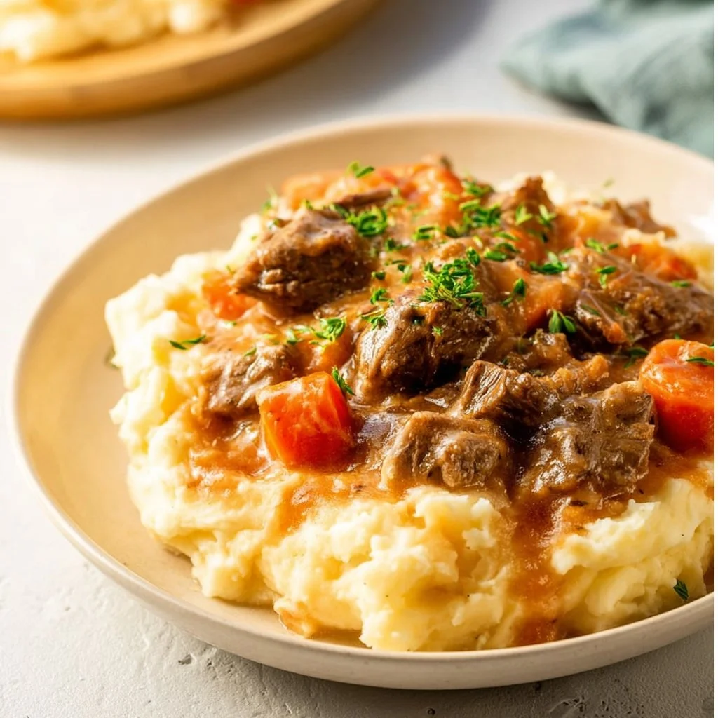 A cozy and heartwarming stew made with beef, apple cider, and served over fluffy mashed potatoes, perfect for fall.