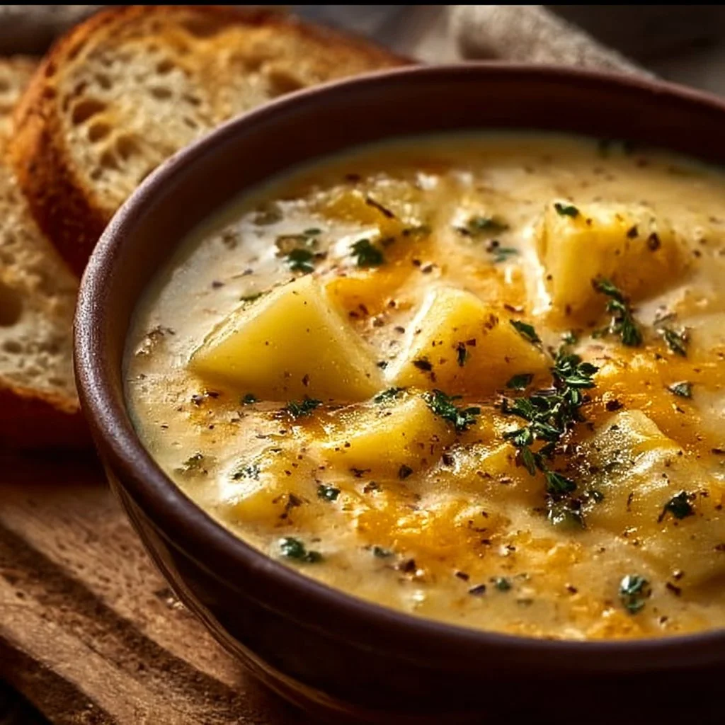 A comforting potato soup enriched with cheddar cheese, garlic, and herbs, perfect for chilly days.