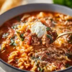 A delicious and comforting lasagna-inspired soup that is high in protein and easy to prepare, perfect for busy weeknights.